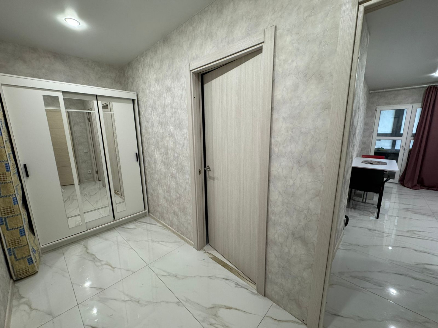 В квартире выполнен качественный евро-ремонт с использованием импортных материалов в светлых тонах. Есть просторное место под шкаф-купе для хранения вещей. Полностью установлена сантехника в ванной комнате.